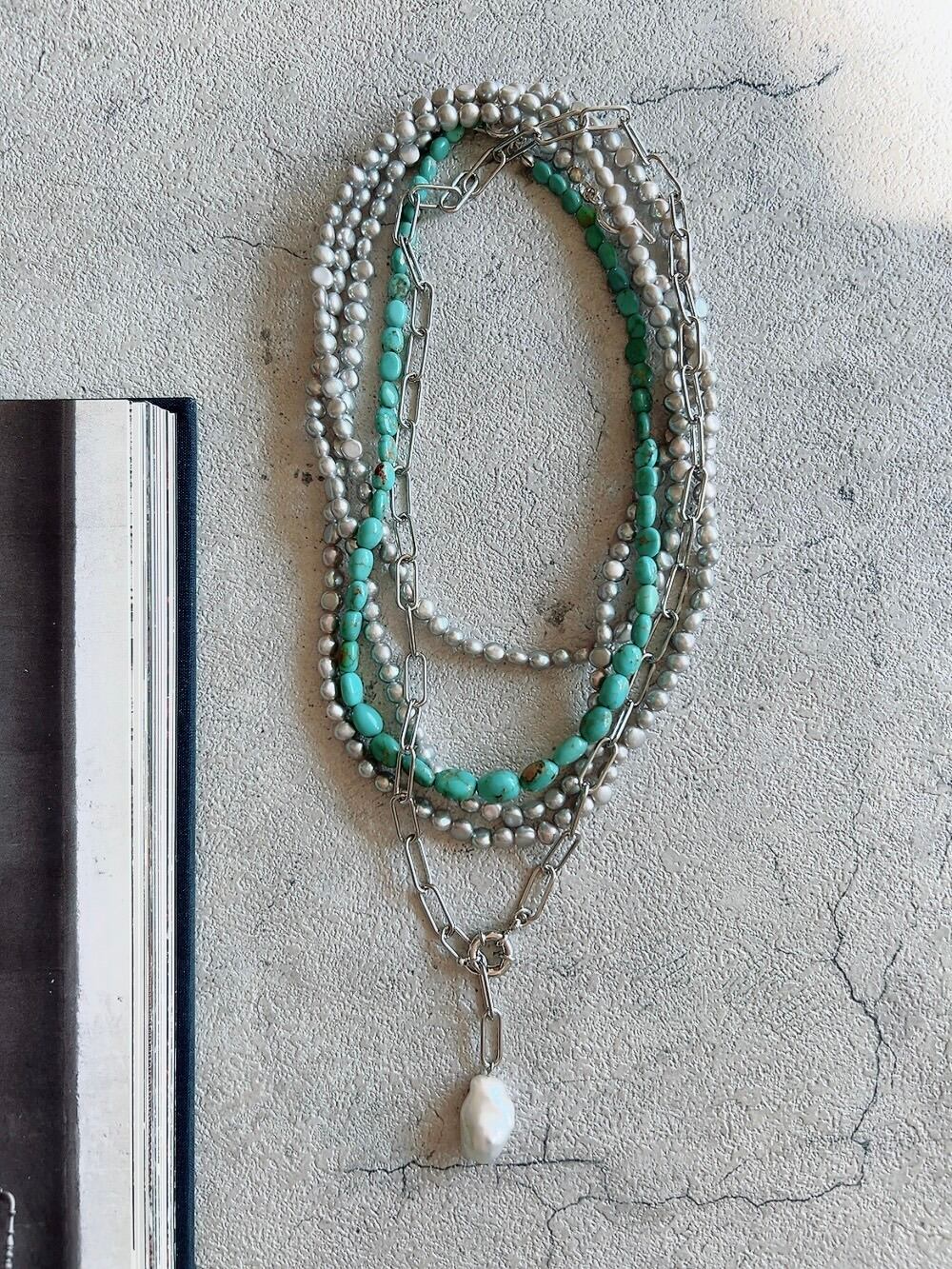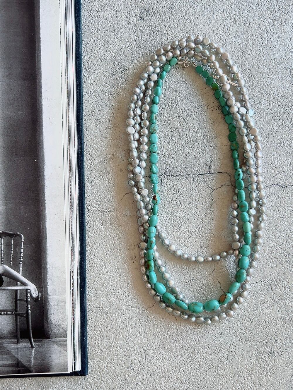 上品なオーバルのターコイズがグラデーションで連なる、一点投入で装いを格上げする一品。