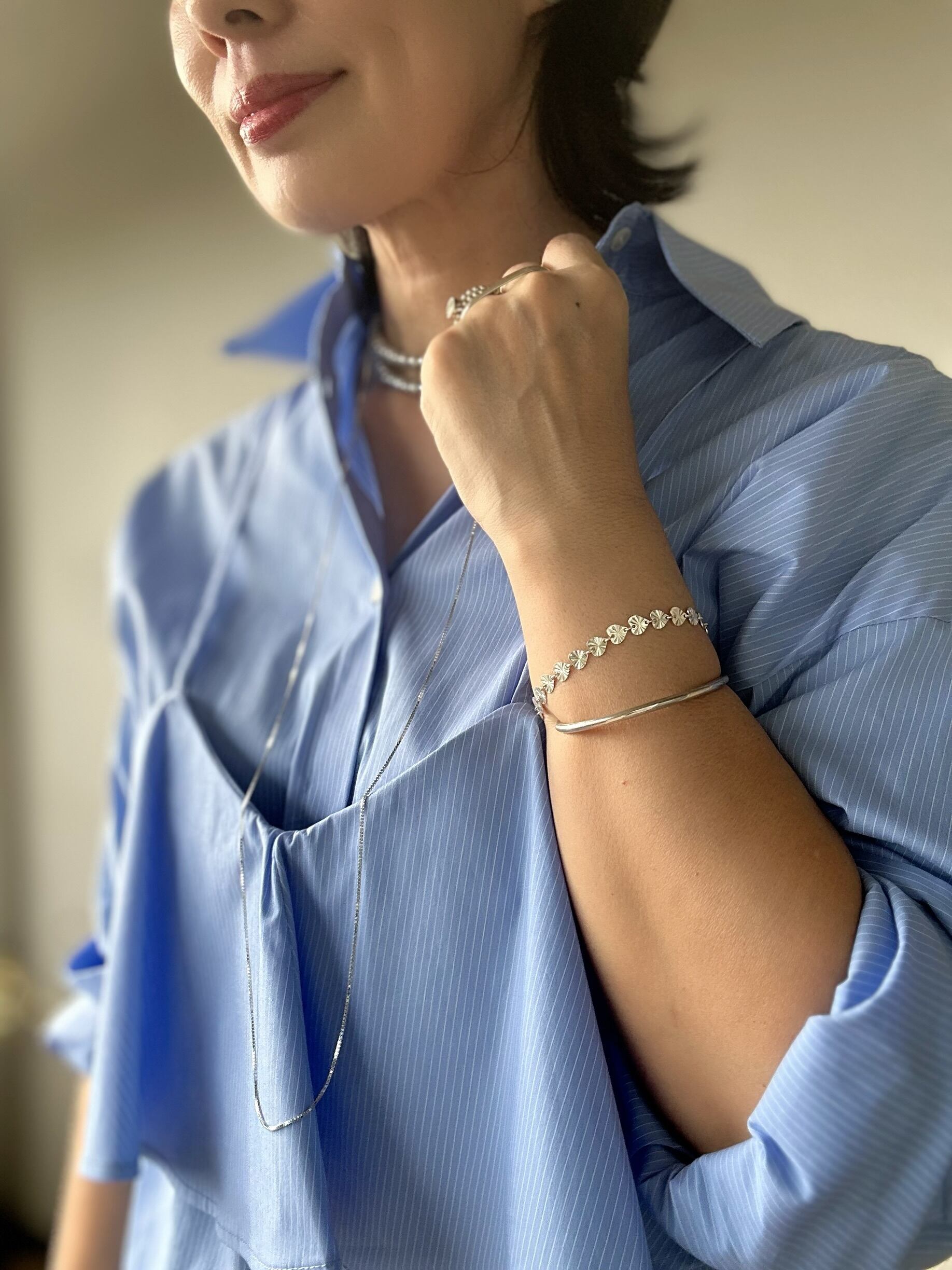 重ねづけには、華奢な3㎜シルバーボールネックレス(90㎝)を5連にして合わせたり、R by auspiceのシルバーバングルとの組み合わせがおすすめ。