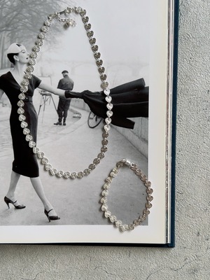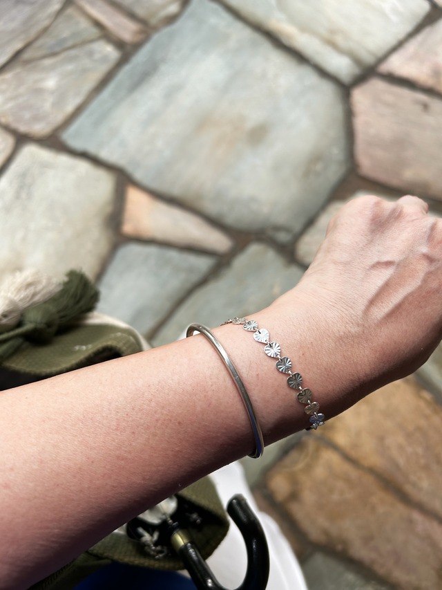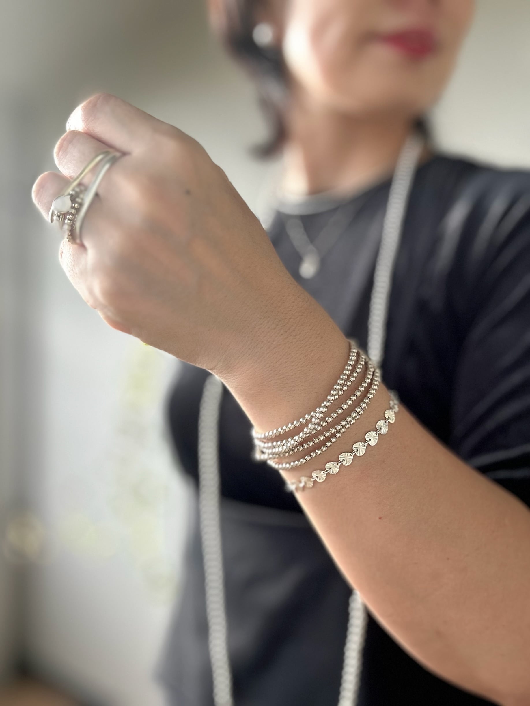 重ねづけには、華奢な3㎜シルバーボールネックレス(90㎝)を5連にして合わせたり、R by auspiceのシルバーバングルとの組み合わせがおすすめ。