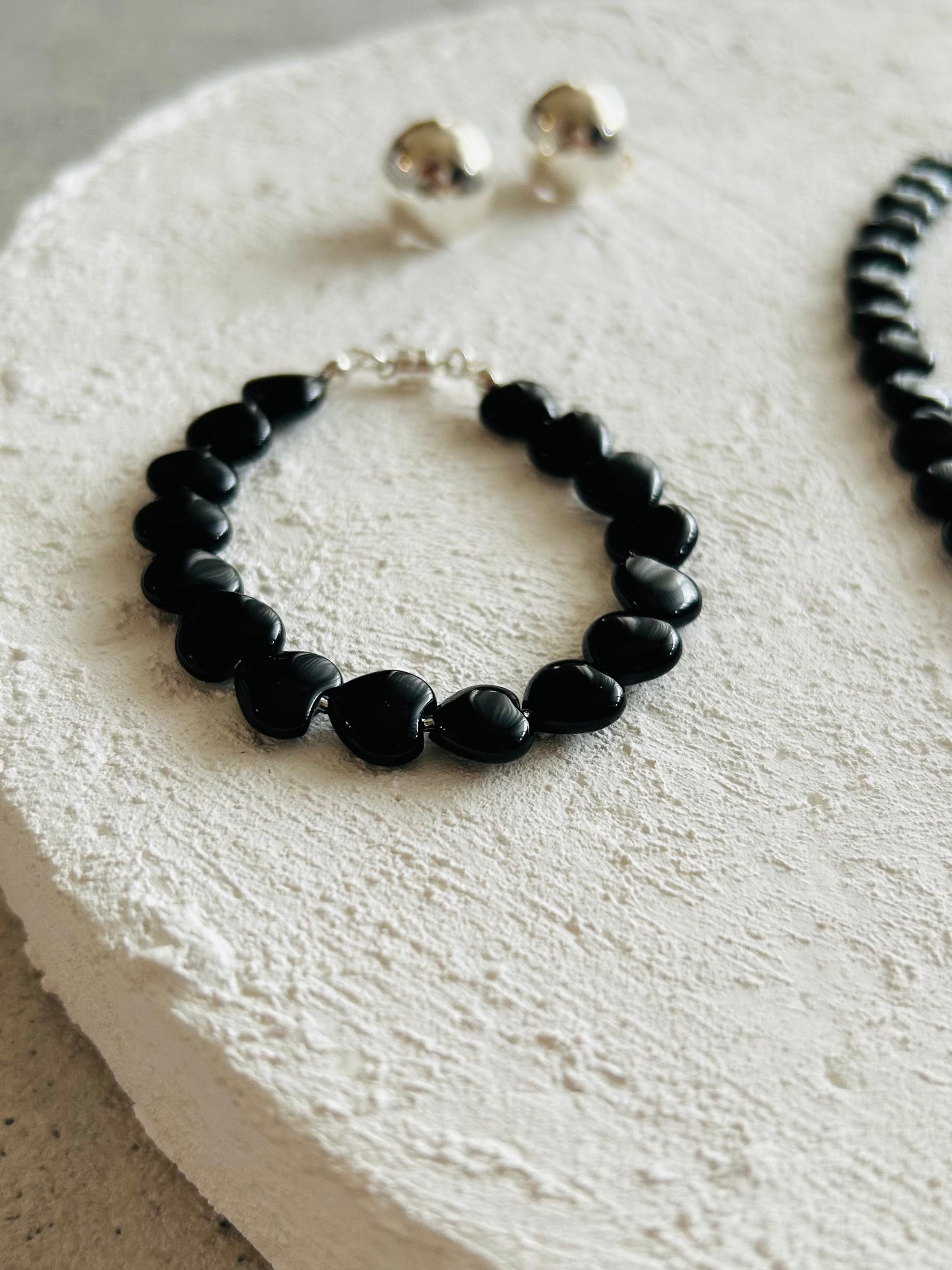 艶やかなブラックオニキスでつないだ、ぷっくりとしたハートのブレスレット。