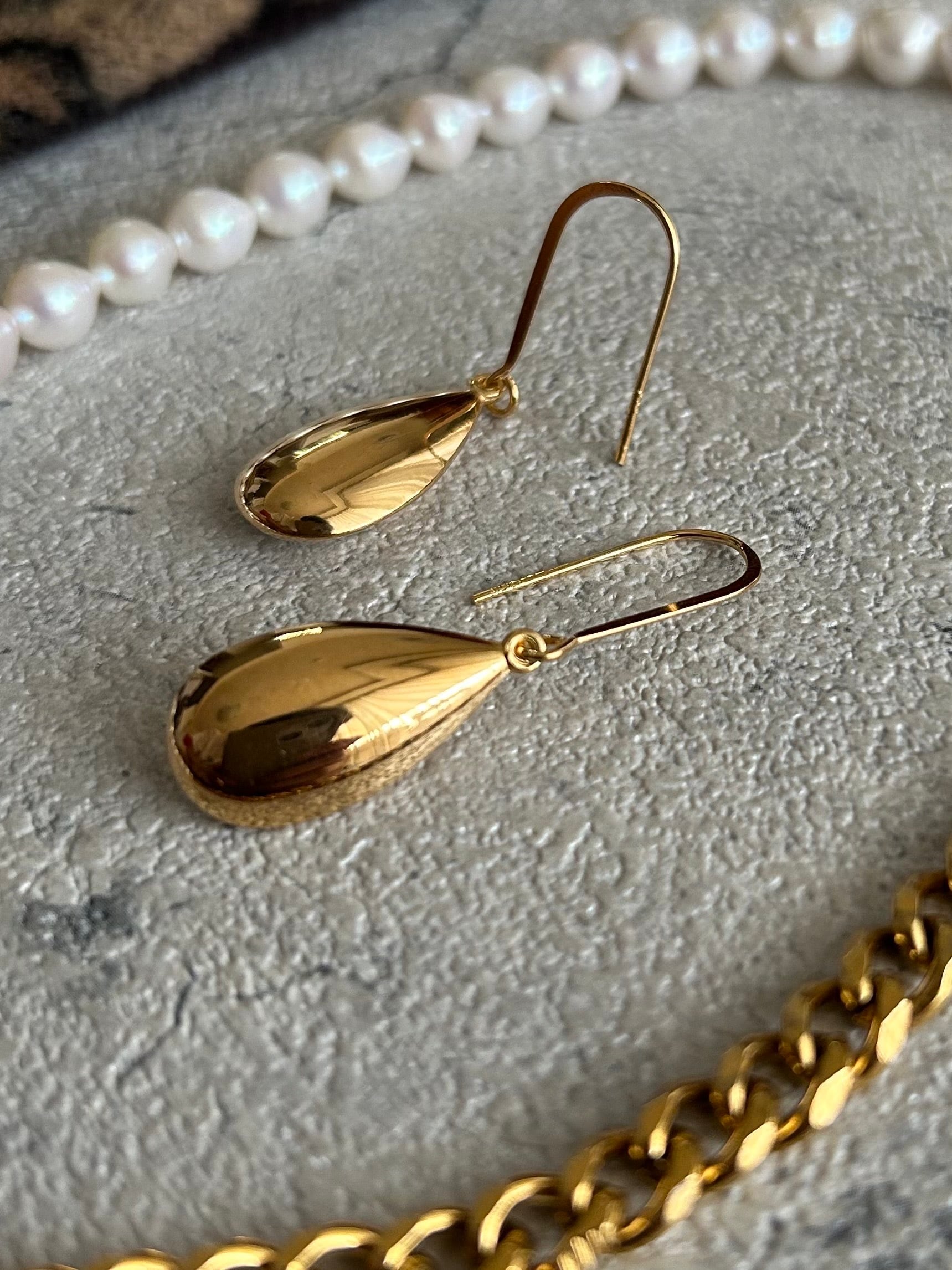 柔らかな光をまとった、ペアシェイプのゴールドピアス(イヤリング)です。