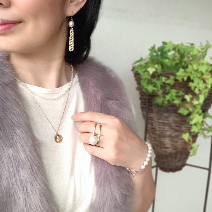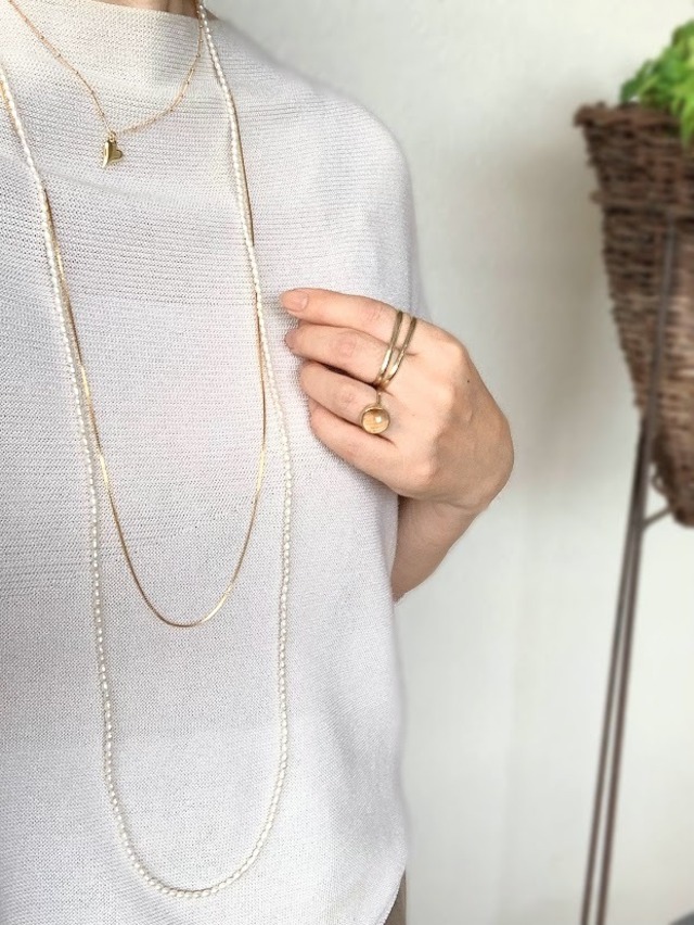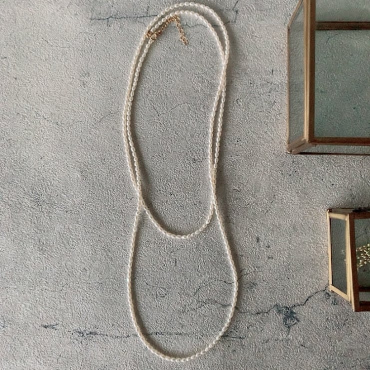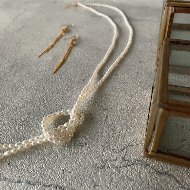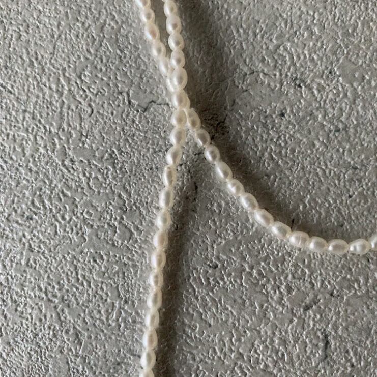 幅3㎜ほどの小粒のライスパールは流れるようなシルエットを描きエレガントですっきりとした印象。