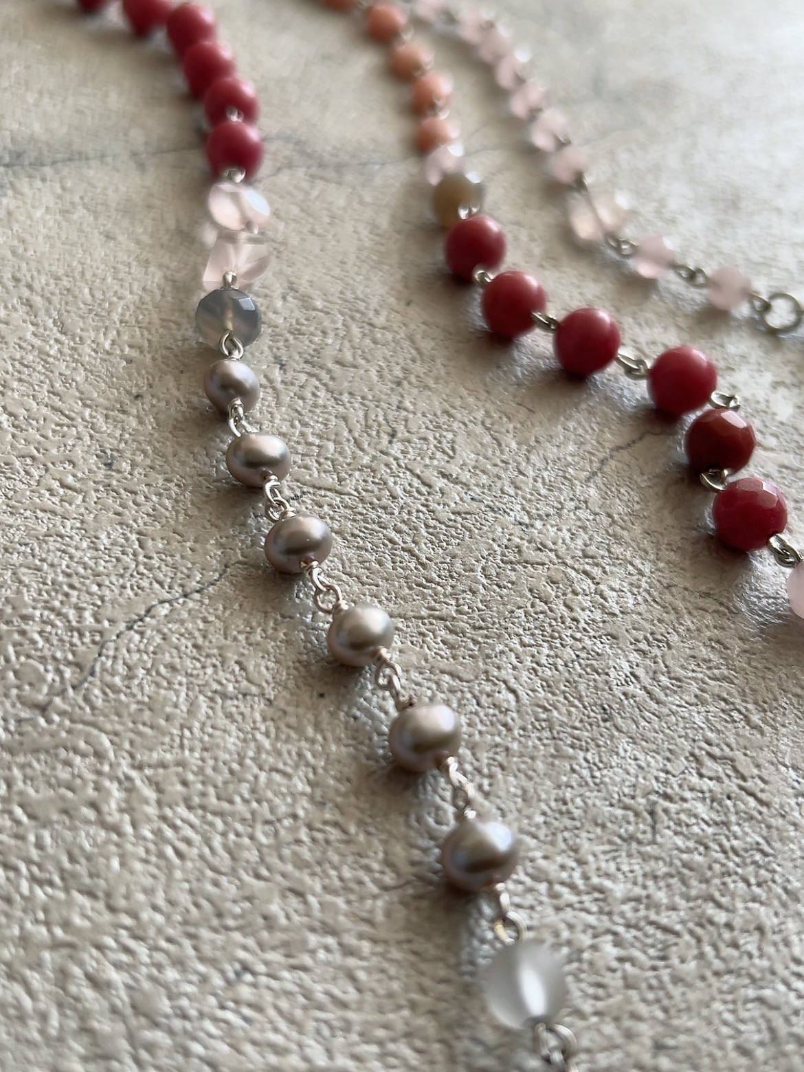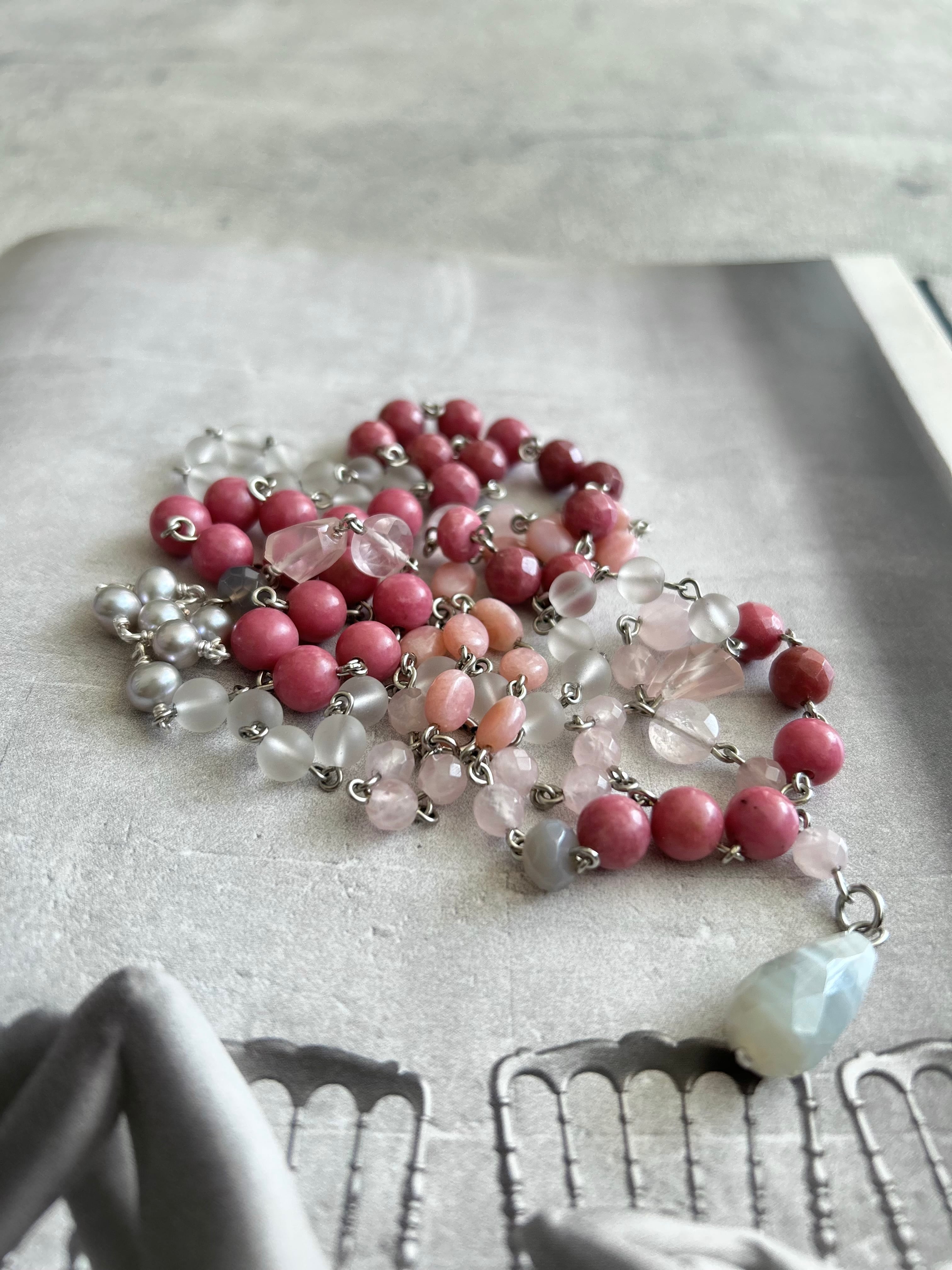 インカローズ、ローズクォーツ、グレーアゲート、シルバーパールなど、表情の異なる天然石を組み合わせた軽やかな色の重なり。
