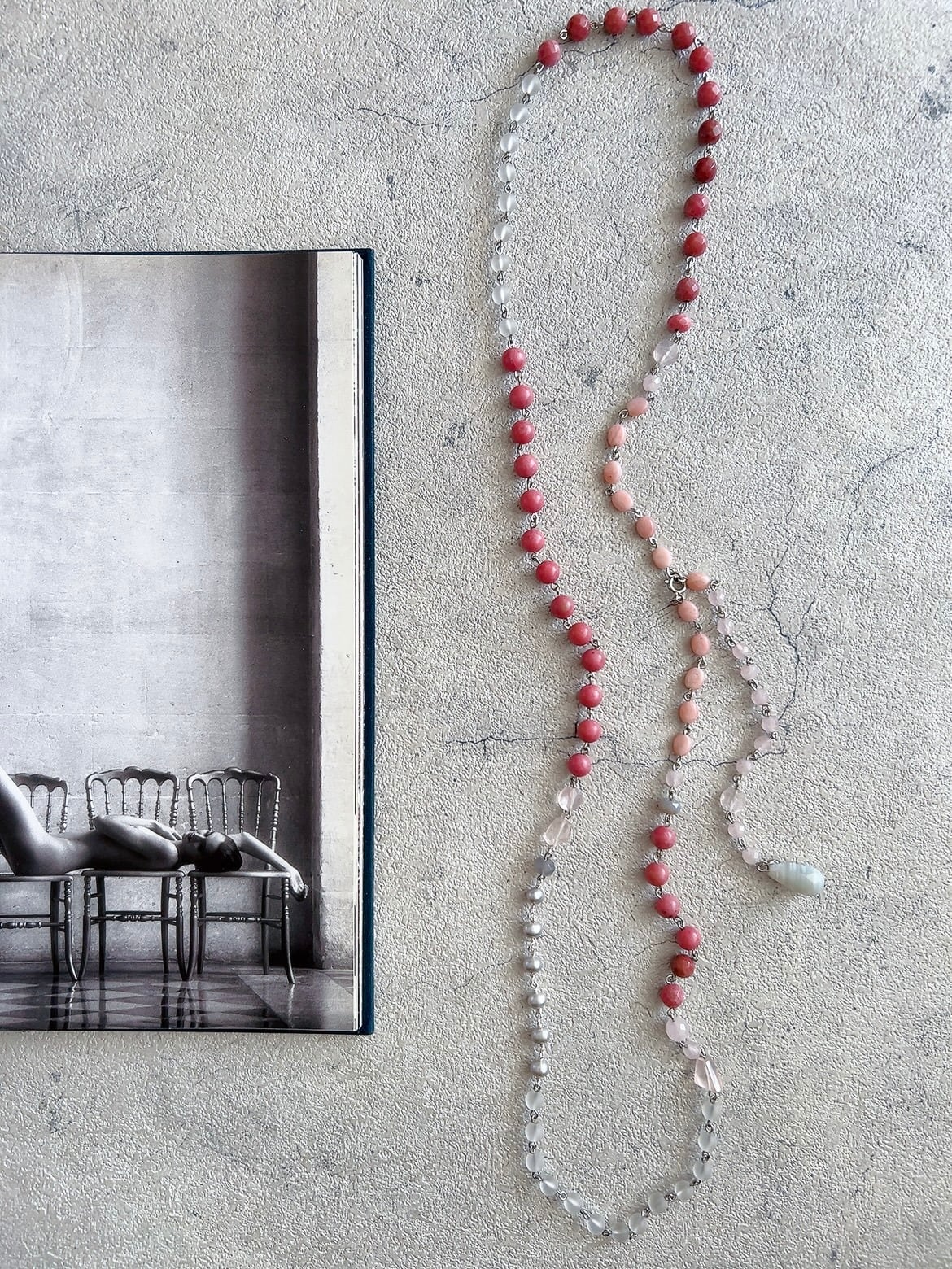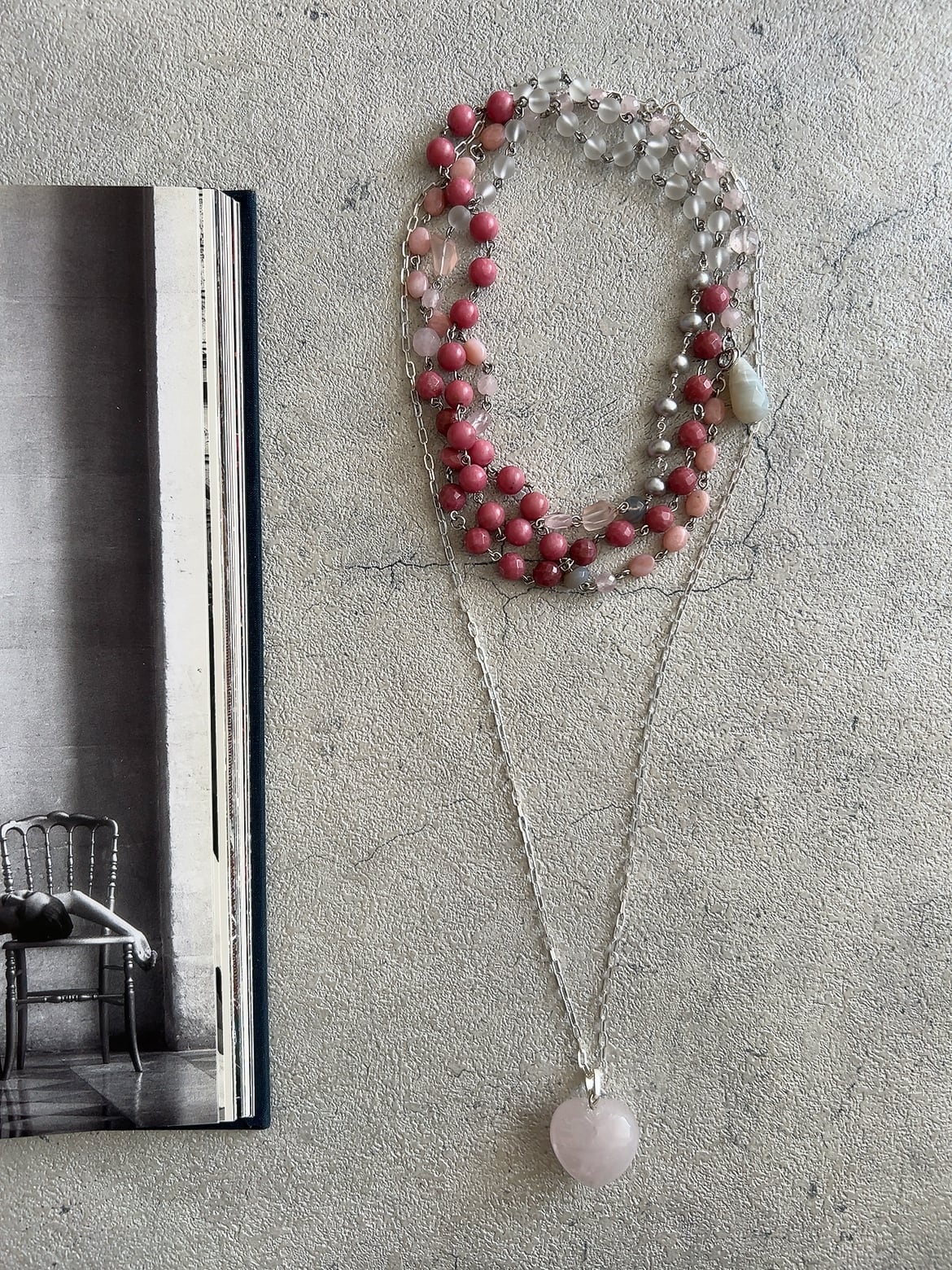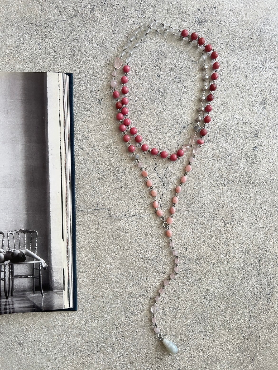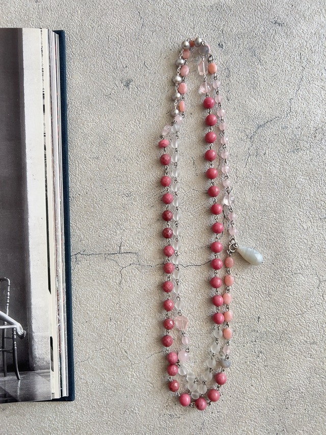 甘さを抑えた、媚びないピンクのロングネックレスです。