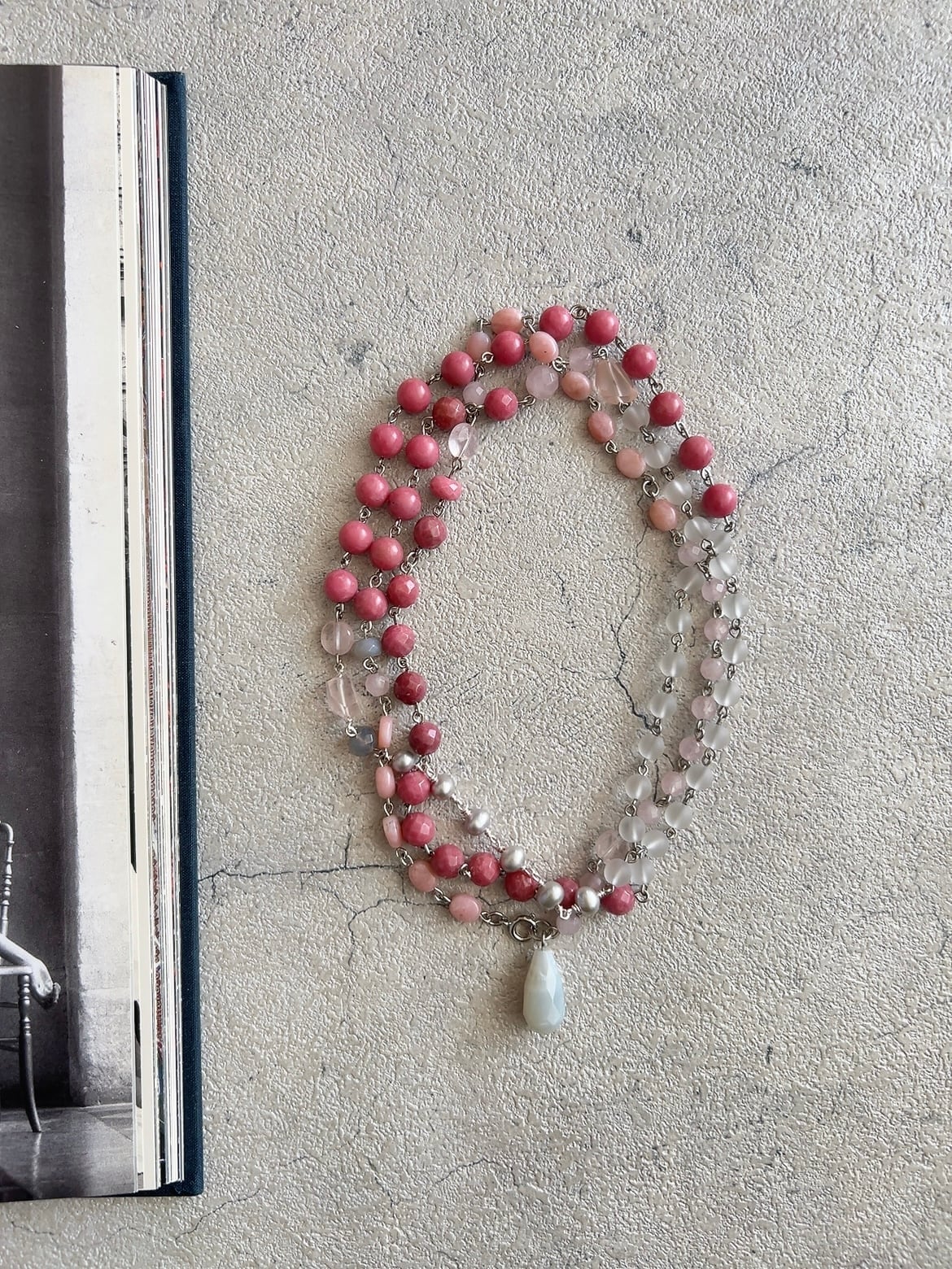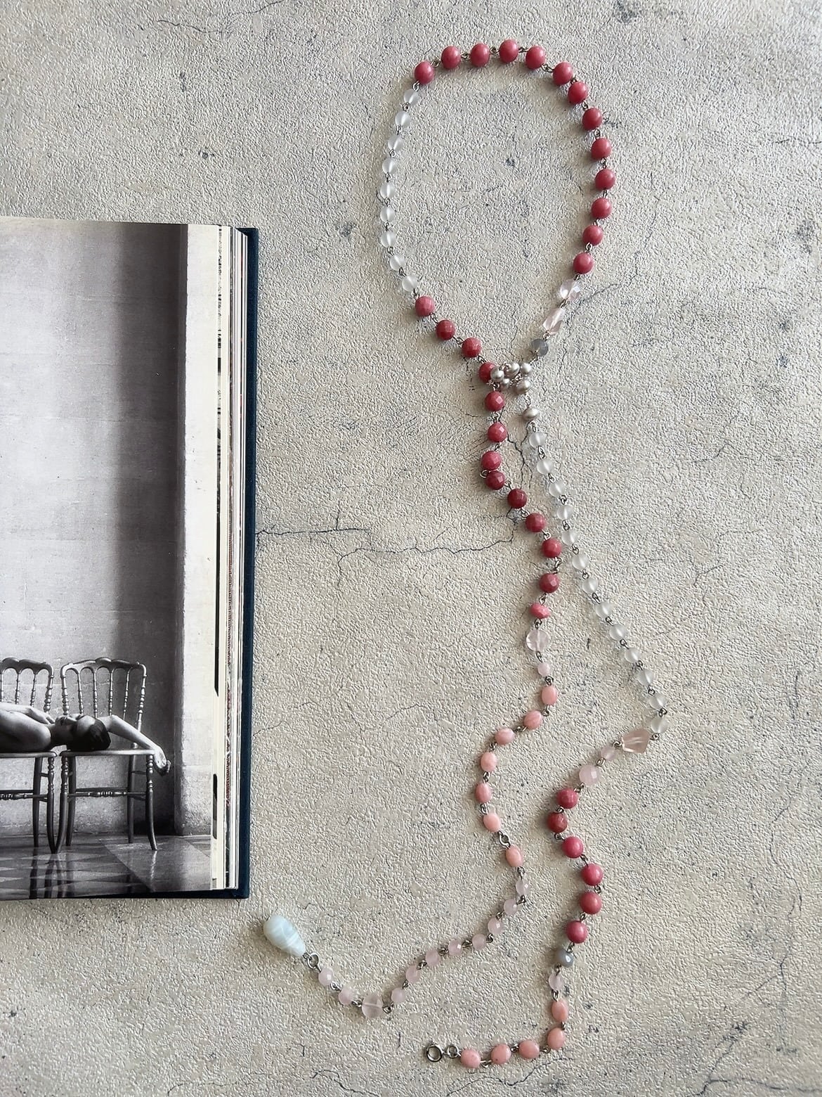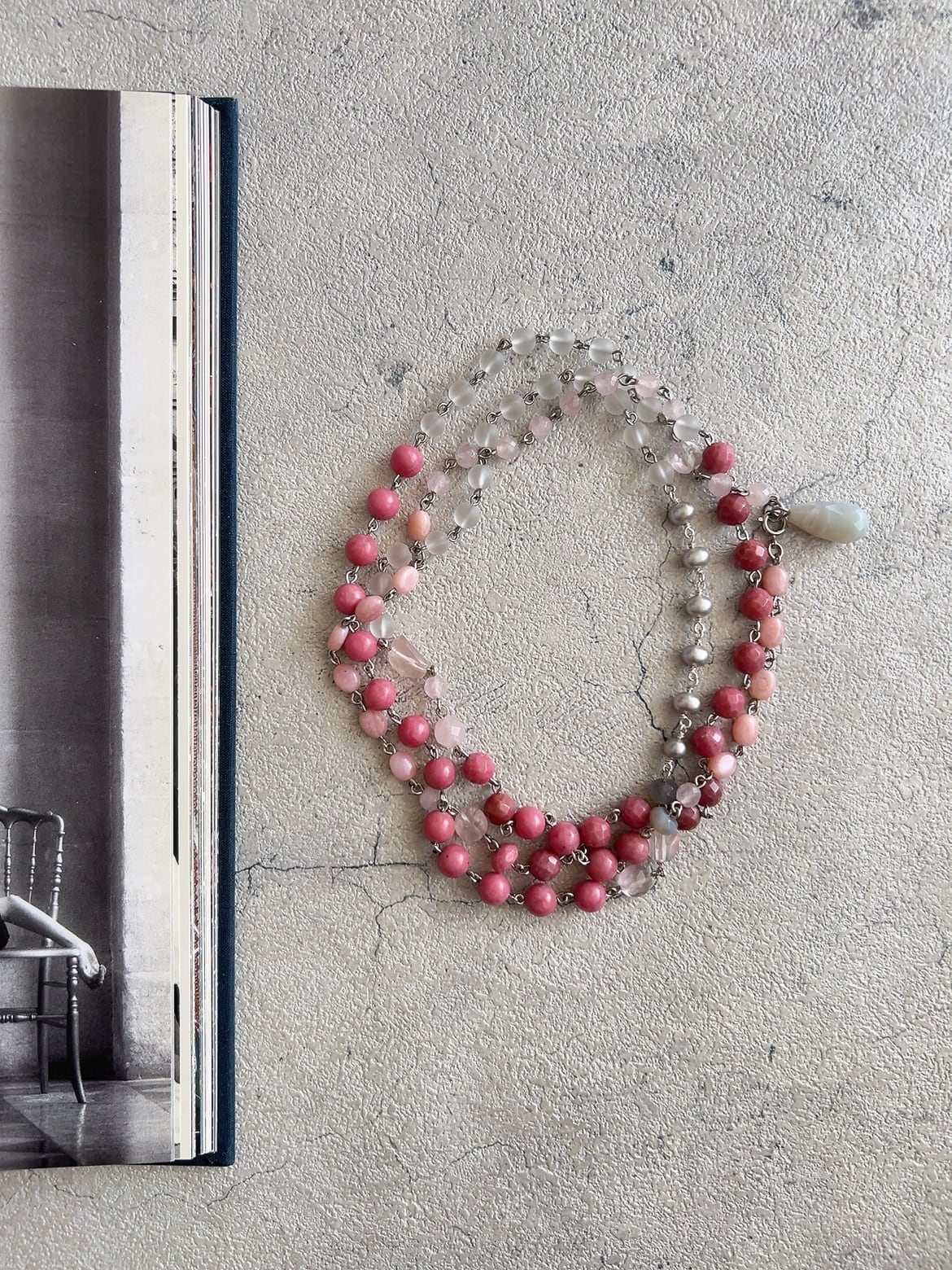 甘さを抑えた、媚びないピンクのロングネックレスです。