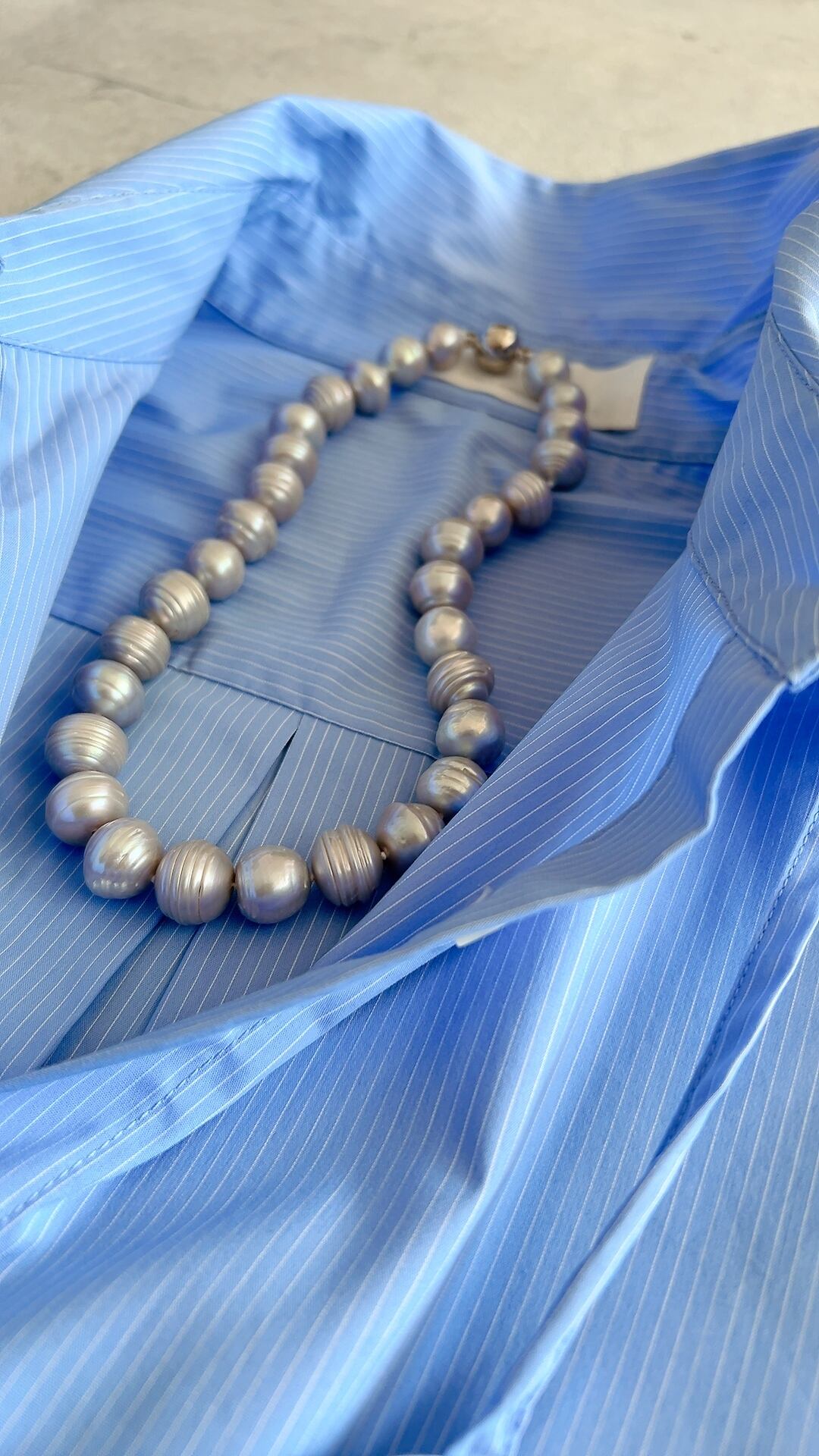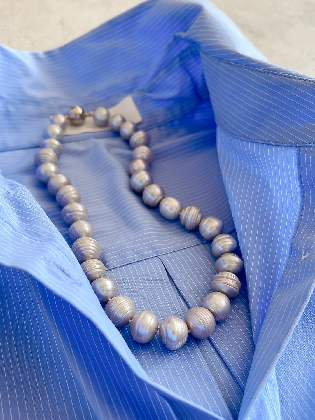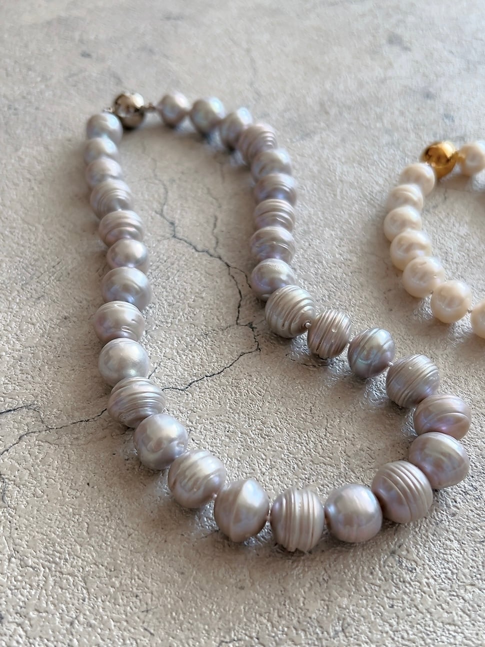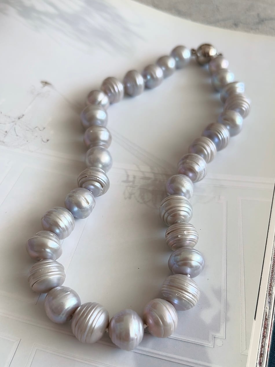 一粒一粒に美しい筋模様が入った、個性的な12mmの淡水パールを贅沢に使用しました。