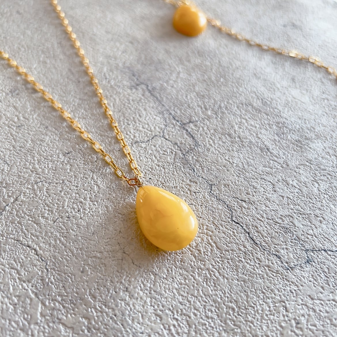 やわらかなイエローが印象的な、ドロップ型のアンバーネックレス。