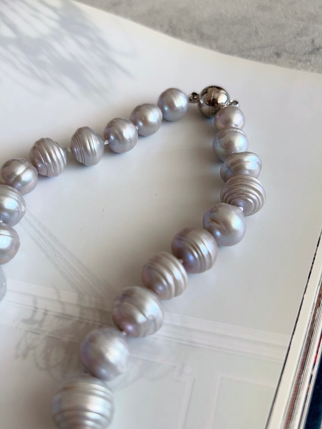 一粒一粒に美しい筋模様が入った、個性的な12mmの淡水パールを贅沢に使用しました。