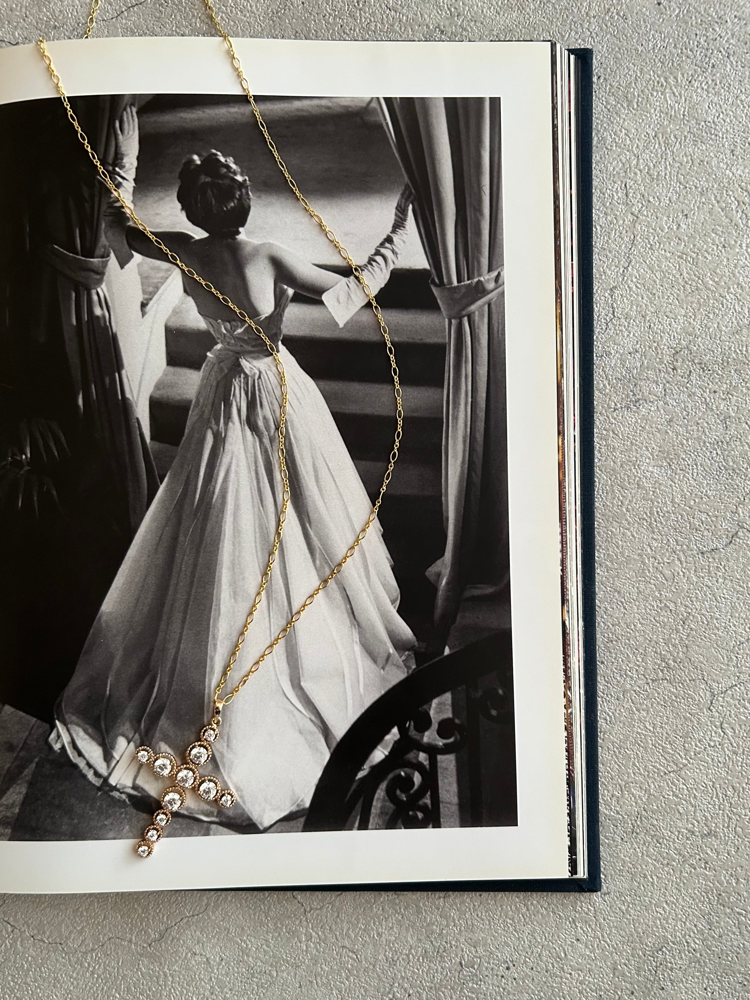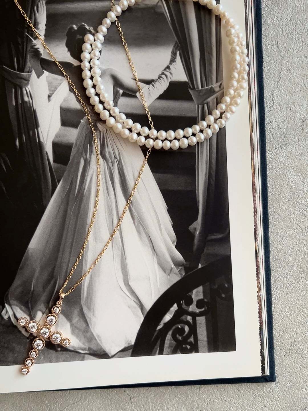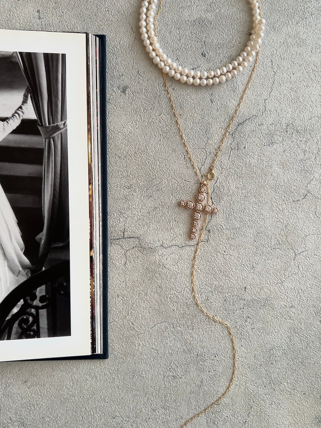 直線的なクロスと丸みのあるチェーンが調和し、大人の装いを自然と品よく見せてくれるロングペンダントです。