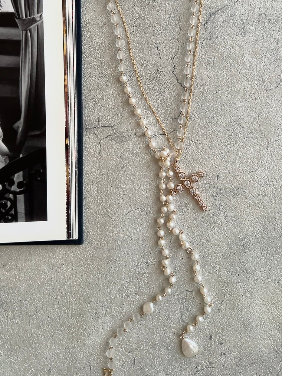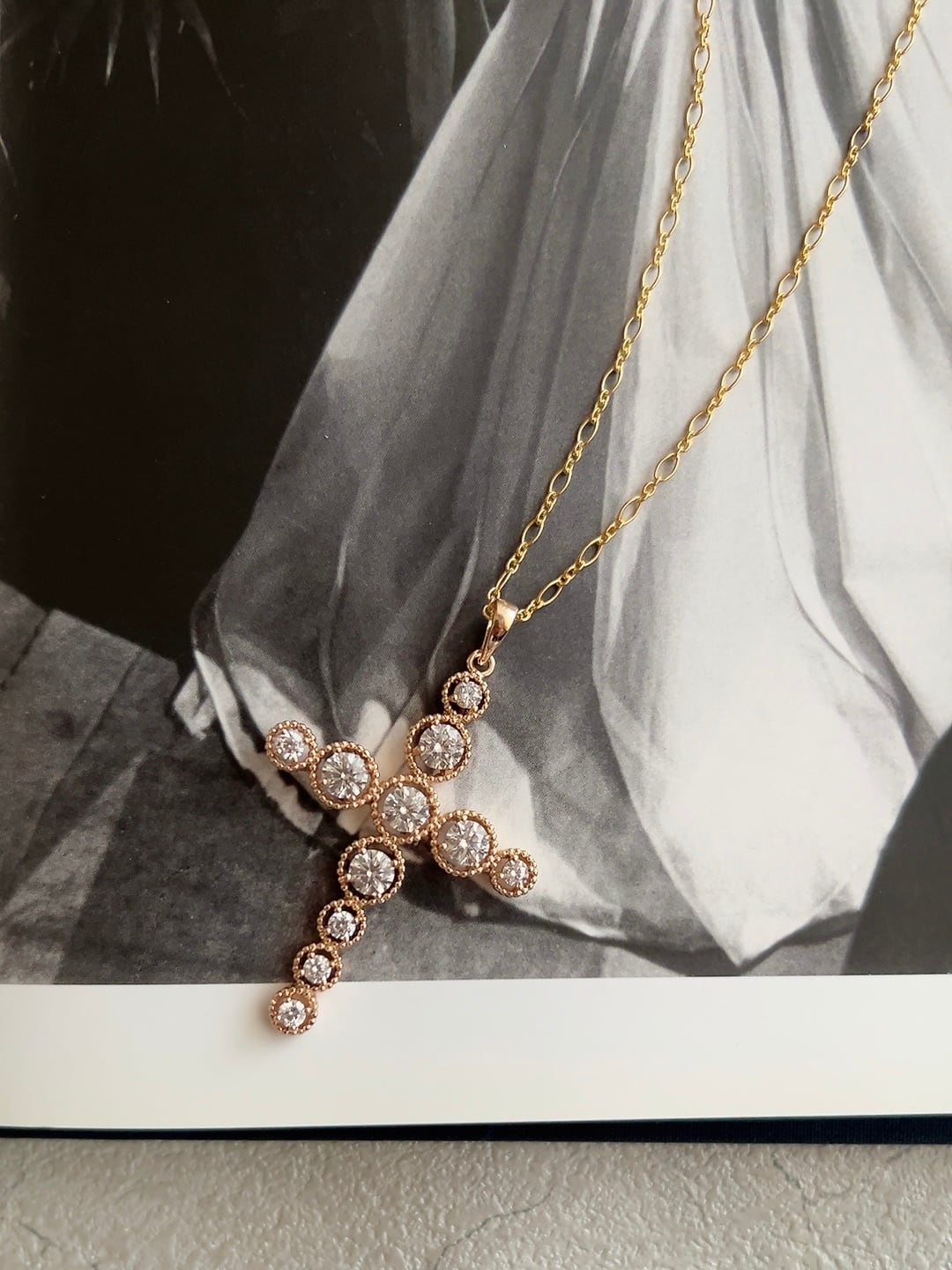 上品なきらめきを添える、クロスモチーフのロングペンダントです。
