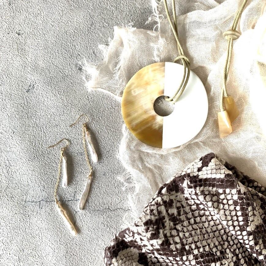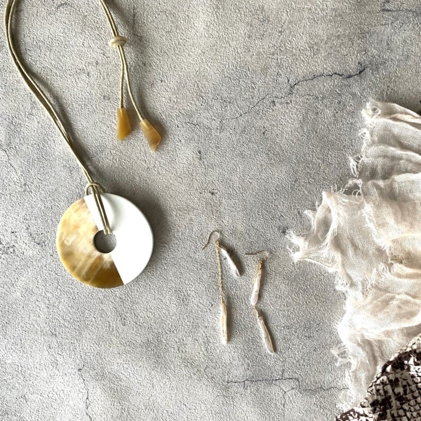 白のラッカー塗りとナチュラルなホーン素材を組み合わせた、洗練されたサークル型ネックレス。