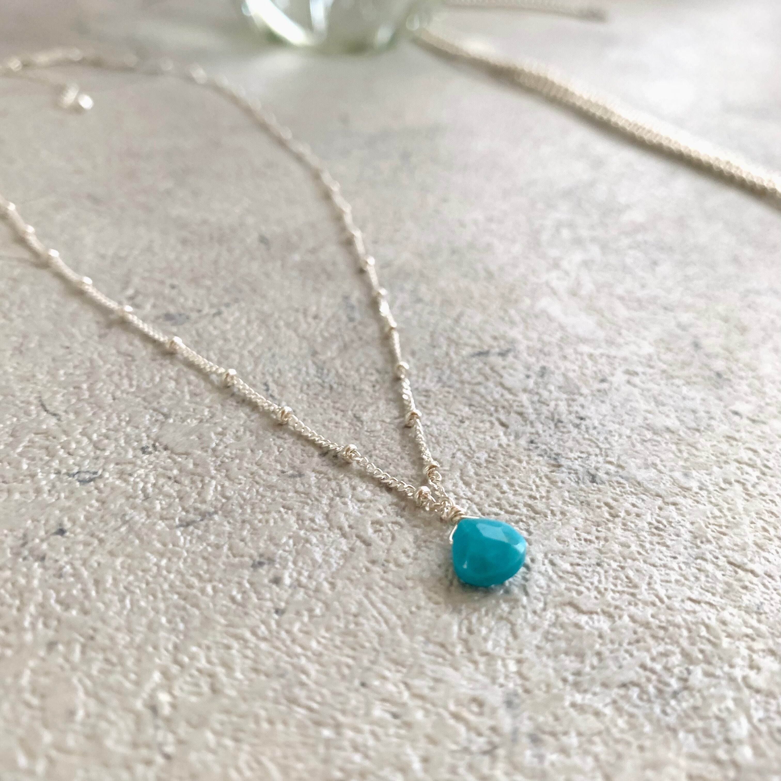美しい色が特徴のアリゾナ産のターコイズはスリーピングビューティー鉱山で採掘されたものです。スリーピングビューティー鉱山はその山の姿が寝そべった女性の横顔に見えることから名づけられた鉱山ですが採掘量減少のため、残念ながら2012年にスリーピングビューティー鉱山は閉山してしまいました。希少価値も高まっているため、年々お値段も高騰している石ですが色もカットも美しいスリーピングビューティーに出会いました。ターコイズ初心者の方でもご利用いただけるようシンプルな一粒ネックレスに仕上げました。単品でご利用いただいても素敵ですが、ターコイズはパールやサンゴ、ラピスラズリなどと相性がいいので是非重ね付けも楽しんでいただけたらと思います。